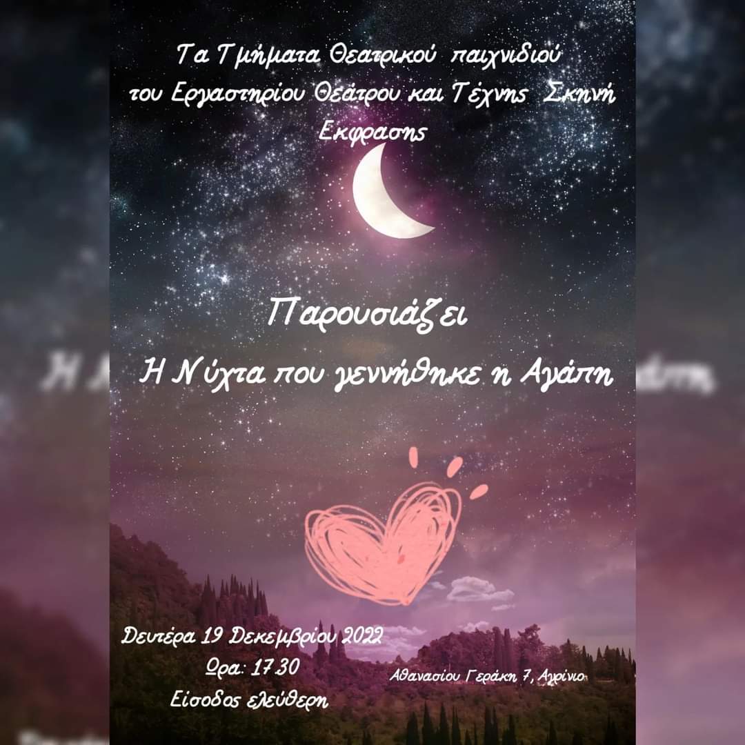 Το Εργαστήριο Θεάτρου και Τέχνης «Σκηνή Έκφρασης» αποχαιρέτησε το 2022 με την παράσταση « Η Νύχτα που Γεννήθηκε η Αγάπη». Οι μαθητές του εφηβικού τμήματος και των τάξεων του δημοτικού ένωσαν τις θεατρικές τους δυνάμεις και κατάφεραν το πιο γλυκό αποτέλεσμα.