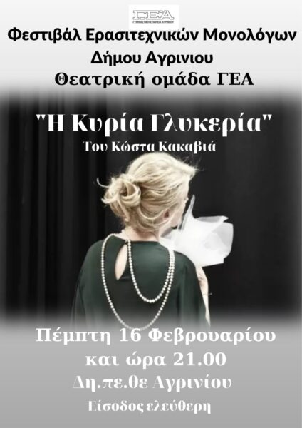 Το Θεατρικό ερασιτεχνικό τμήμα της Γυμναστικής Εταιρείας Αγρινίου συμμετέχει στο 6ο Φεστιβάλ Μονολόγων Ερασιτεχνών, που διοργανώνει ο Δήμος Αγρινίου, με τον μονόλογο «Η Κυρία Γλυκερία» του Κώστα Κακαβιά.