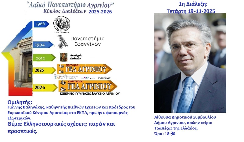 Το 4ο ΓΕΛ και το 6ο ΓΕΛ Αγρινίου σε συνεργασία με το Σχολείο Δεύτερης Ευκαιρίας Αγρινίου και το Εσπερινό Γυμνάσιο-Λύκειο Αγρινίου ξεκινά για 2η συνεχή χρονιά στο Αγρίνιο, έναν σημαντικό κύκλο Πανεπιστημιακών διαλέξεων με τίτλο «Λαϊκό Πανεπιστήμιο».