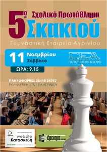 Το σκακιστικό τμήμα της Γυμναστικής Εταιρείας Αγρινίου οργανώνει το Σάββατο 11 Νοεμβρίου 2017 στις 9.15 π.μ. στην αίθουσα δεξιώσεων του Παπαστρατείου Μεγάρου το πέμπτο σχολικό πρωτάθλημα Αγρινίου.