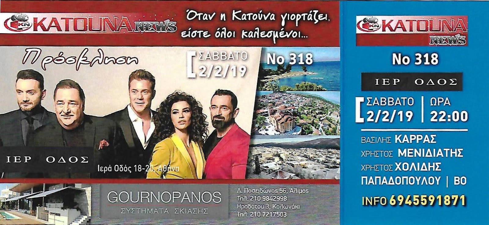 Σας προσκαλούμε στον χορό των απανταχού Κατουνιωτών και φίλων, που θα πραγματοποιηθεί στο κέντρο “Ιερά οδός” Ιερά οδός 18-20 το Σάββατο 2 Φεβρουαρίου 2019, για μια αξέχαστη βραδιά με τους Βασίλη Καρρά, Χρήστο Μενιδιάτη, Χρήστο Χολίδη, Ειρήνη Παπαδοπούλου & Bo .