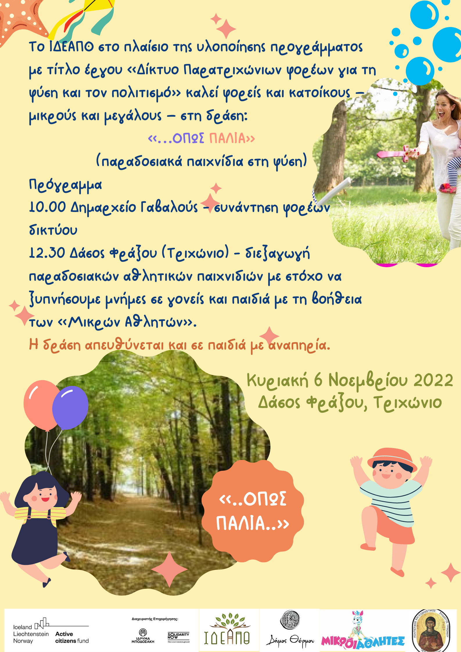 Στη συνέχεια στις 12.30 στη θέση Τριχώνιο, Δάσος Φράξου σε συνεργασία με το αθλητικό κέντρο “Μικροί Αθλητές” διοργανώνεται αθλητική δράση με την καθοδήγηση της κυρίας Αλεξάνδρας Μαρκάτη. Στόχος, γονείς και παιδιά να αλληλεπιδράσουν μεταξύ τους κινητικά και συναισθηματικά με σκοπό να νιώσουν τη χαρά του παιχνιδιού καθώς και τα οφέλη της κίνησης στην υγεία, στέλνοντας έτσι ένα μήνυμα κατά του καθιστικού τρόπου ζωής. Στον ανοιχτό χώρο του δάσους, θα έχουν στηθεί σταθμοί, όπου μέσα θα βρίσκεται από ένας εμψυχωτής. Στον σταθμό θα διαδραματίζονται από 2-3 παραδοσιακά παιχνίδια καθ’ όλη τη διάρκεια της ώρας. Στο κέντρο του χώρου των σταθμών, θα υπάρχει ένας «χώρος συναισθημάτων», όπου οι γονείς κυρίως, θα έχουν την ευκαιρία να συμμετέχουν σε προγράμματα ευεξίας πχ yoga, διατάσεις, διαλογισμός, συζήτηση, ενώ, θα μπορούν να εκφράσουν σκέψεις αποτυπώνοντάς τις σε ένα μεγάλο χαρτί του μέτρου (κείμενα, ζωγραφιές, κολάζ κτλ). Θα χρησιμοποιηθεί εξοπλισμός, όπως, ενδοεπικοινωνία, κώνοι, στεφάνια, τσουβάλια, βόλοι, μπάλες, μπάλες πετάνγκ, μαντιλάκια, σχοινί, διελκινστιδα, ταινία οριοθέτησης, μπαλόνια, καρέκλες, νερά κτλ.  Θα χορηγηθούν νερά και μικρό σνακ στους συμμετέχοντες στη δράση.