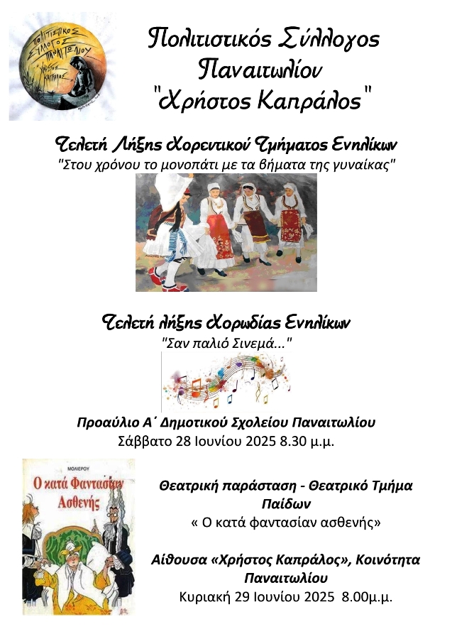 Το Σάββατο 28 Ιουνίου και ώρα 20.30 στο προαύλιο του Α΄ Δημοτικού Σχολείου Παναιτωλίου, θα γίνουν οι τελετές λήξης των τμημάτων Χορωδίας και Χορευτικού Ενηλίκων.