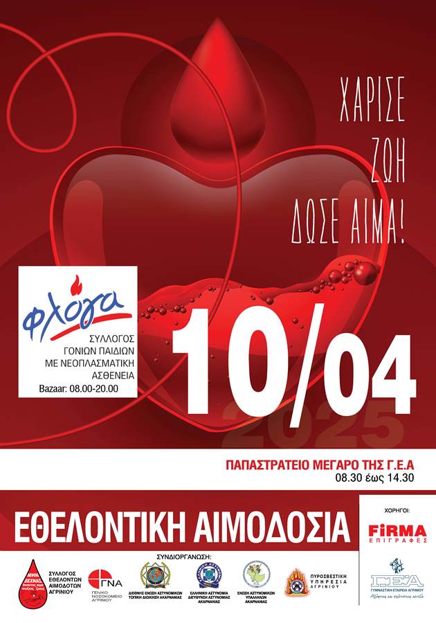 Η Εθελοντική αιμοδοσία θα πραγματοποιηθεί στο Παπαστράτειο Μέγαρο της Γυμναστικής Εταιρίας Αγρινίου στις 10 Απρίλη από 08:30 έως 14:30 σε συνεργασία με τον σύλλογο εθελοντών αιμοδοτών Αγρινίου, του τμήματος αιμοδοσίας του Γ.Ν Αγρινίου, της Π.Υ Αγρινίου, της Δ.Α Ακαρνανίας και της Ε.Α.Υ Ακαρνανίας. Μέσω των δύο δράσεων θα υποστηριχθούν. Το χαμόγελο του παιδιού καθώς θα υπάρχει στο χώρο της διεξαγωγής των αγώνων πασχαλινή αγορά για την υποστήριξη της δομής και ο σύλλογος γονέων παιδιών με νεοπλασματικές ασθένειες «Η ΦΛΟΓΑ», η οποία θα έχει πασχαλινή αγορά στον χώρο της αιμοδοσίας στο Παπαστράτειο μέγαρο Αγρινίου.