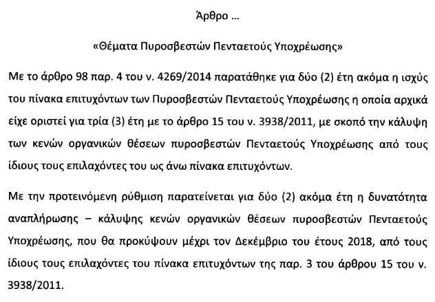 Η προτεινόμενη διάταξη παρατείνει για δύο ακόμη έτη τη δυνατότητα αναπλήρωσης – κάλυψης κενών οργανικών θέσεων πυροσβεστών Πενταετούς Υποχρέωσης, που θα προκύψουν μέχρι τον Δεκέμβριο του 2018, από τους ίδιους τους επιλαχόντες του πίνακα επιτυχόντων του 2011.