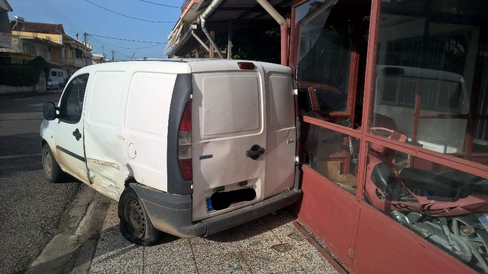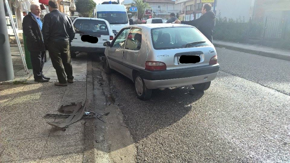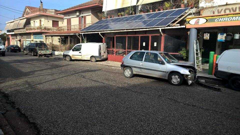 Νεότερη ενημέρωση: Το ατύχημα έγινε ως εξής: οδηγός, κινούμενος επί της οδού Αγγελοκάστρου, για άγνωστους μέχρι στιγμής λόγους, προσέκρουσε σε σταθμευμένο όχημα που βρισκόταν στην άκρη του δρόμου. Εκείνο, λόγω της σύγκρουσης, μετατοπίστηκε και έπεσε εν συνεχεία πάνω σε ένα σιδερένιο σκέπαστρο μαγαζιού. Το ευτυχές είναι ότι δεν υπήρξε κανένας τραυματισμός παρά μόνο υλικές ζημιές.