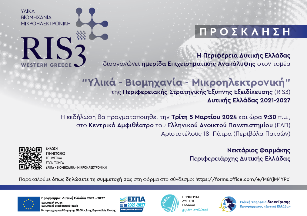 H Περιφέρεια Δυτικής Ελλάδας διοργανώνει την τρίτη κατά σειρά ημερίδα Επιχειρηματικής Ανακάλυψης στο πλαίσιο της εξειδίκευσης της Εθνικής Στρατηγικής Έξυπνης Εξειδίκευσης (RIS3) στην Δυτική Ελλάδα, την Τρίτη 5 Μαρτίου 2024 και ώρα 9:30 το πρωϊ, στο Κεντρικό Αμφιθέατρο του Ελληνικού Ανοικτού Πανεπιστημίου (Αριστοτέλους 18), στην Πάτρα.