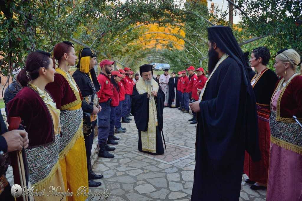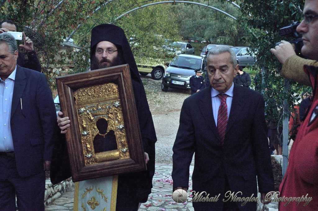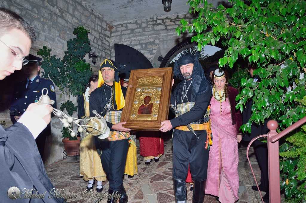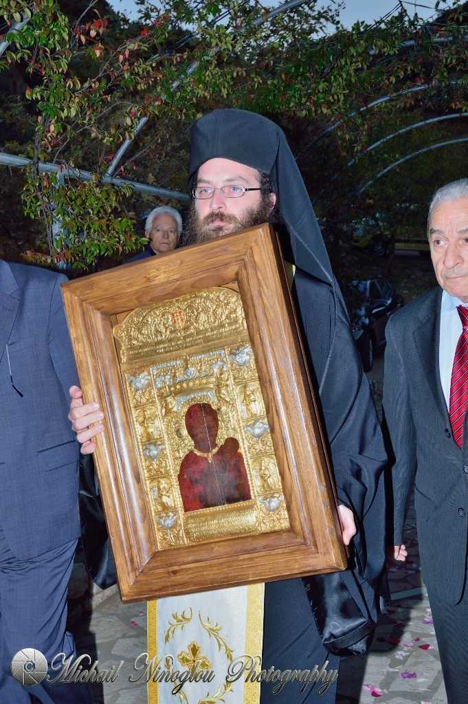 Στην υποδοχή, τη Δοξολογία και τον αρχιερατικό Εσπερινό που ακολούθησαν προεξήρχε ο Σεβασμιώτατος Μητροπολίτης Αιτωλίας και Ακαρνανίας κ. Κοσμάς. Κατά την υποδοχή, στον προαύλιο χώρο της Ιεράς Μονής, ο Σεβασμιώτατος παρέδωσε την ιερά Εικόνα στα μέλη του Συλλόγου Ποντίων Αιτωλοακαρνανίας «Δημήτρης Ψαθάς», τα οποία ήταν ντυμένα με παραδοσιακές ποντιακές στολές, για να την μεταφέρουν εντός του Καθολικού, όπου τέθηκε σε προσκύνηση.