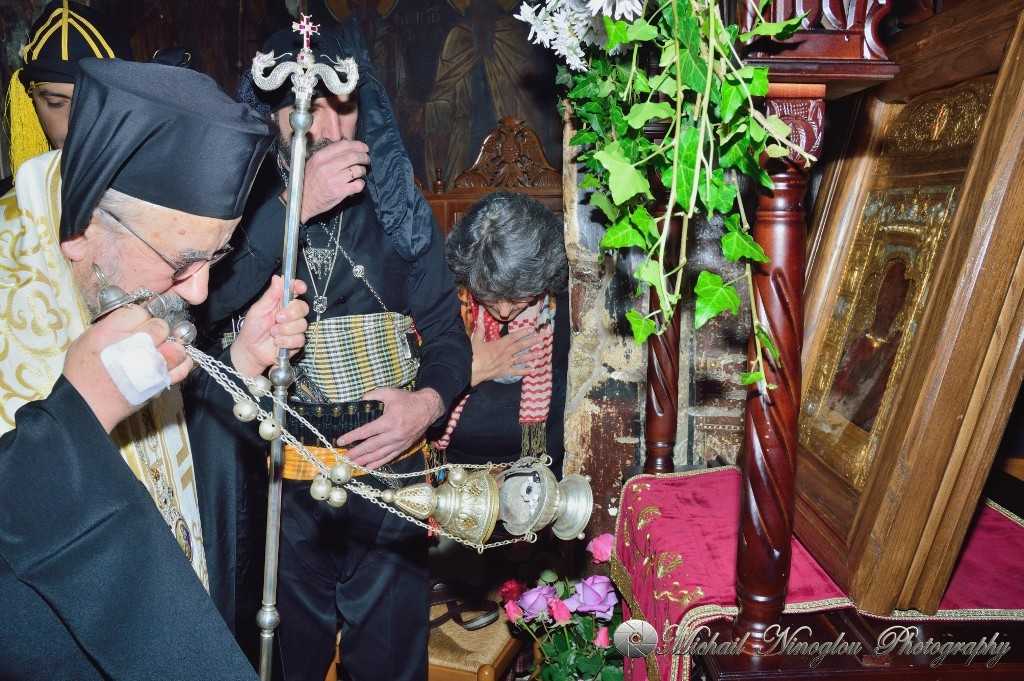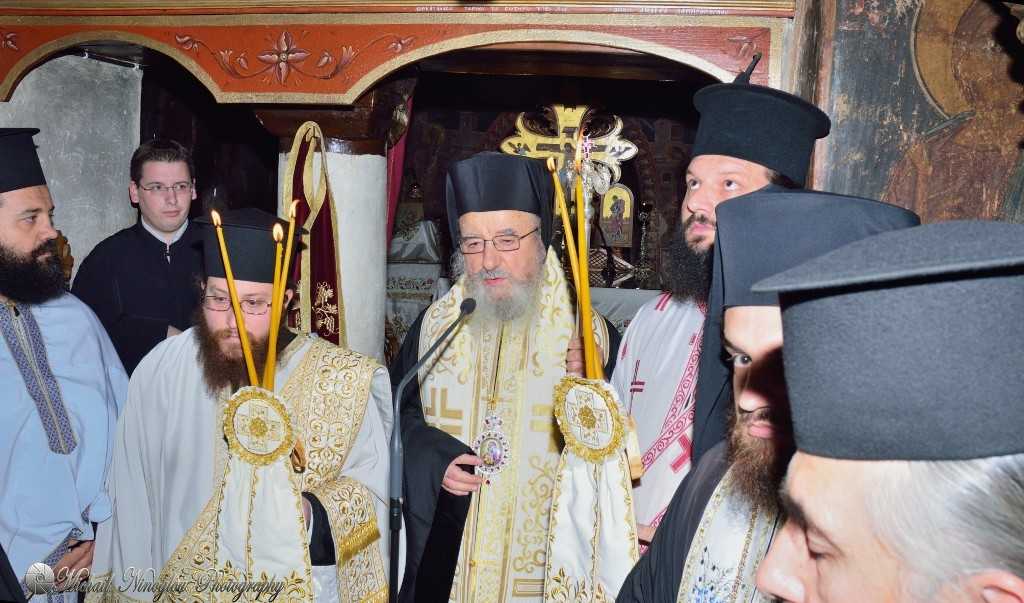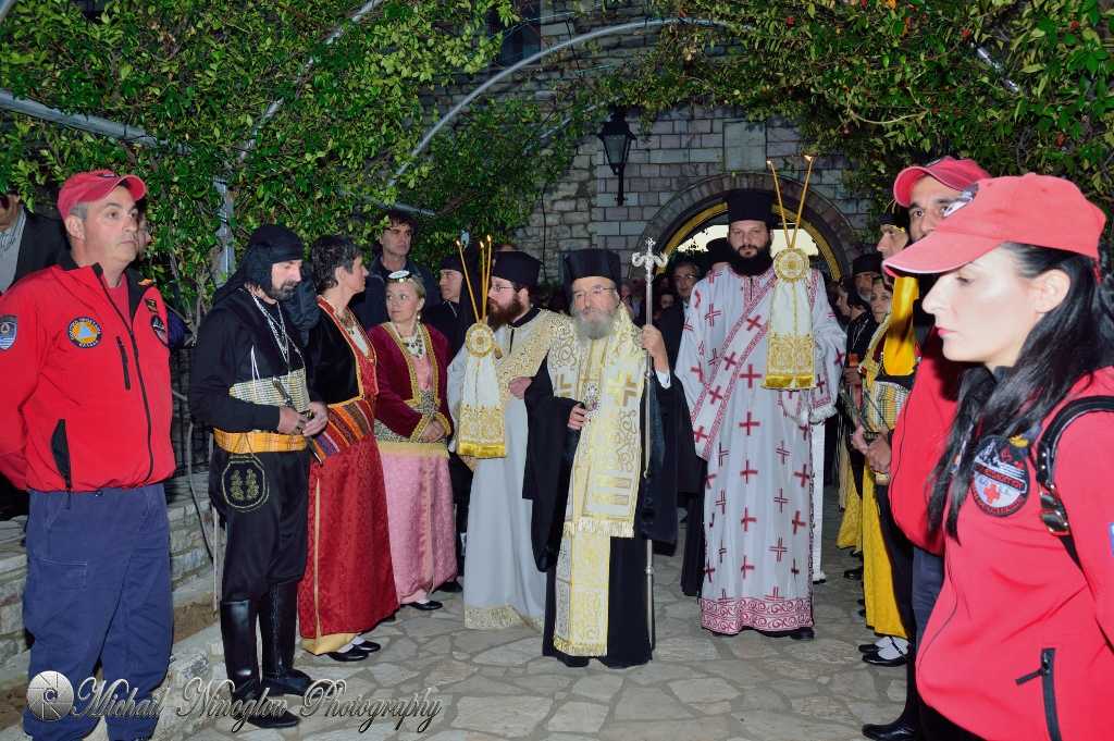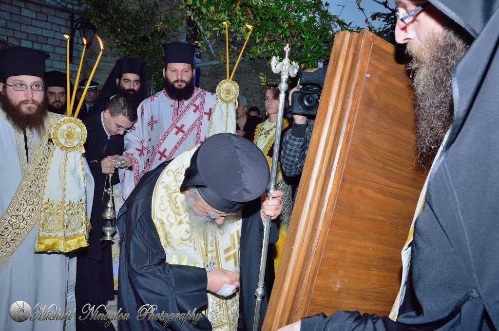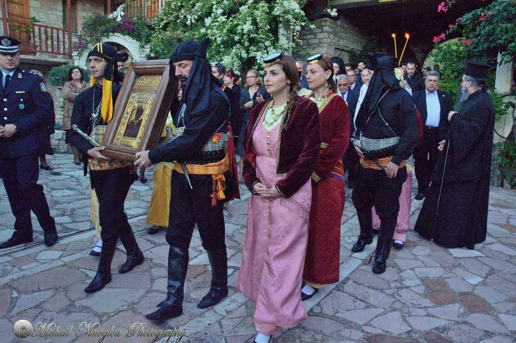 Στην υποδοχή, τη Δοξολογία και τον αρχιερατικό Εσπερινό που ακολούθησαν προεξήρχε ο Σεβασμιώτατος Μητροπολίτης Αιτωλίας και Ακαρνανίας κ. Κοσμάς. Κατά την υποδοχή, στον προαύλιο χώρο της Ιεράς Μονής, ο Σεβασμιώτατος παρέδωσε την ιερά Εικόνα στα μέλη του Συλλόγου Ποντίων Αιτωλοακαρνανίας «Δημήτρης Ψαθάς», τα οποία ήταν ντυμένα με παραδοσιακές ποντιακές στολές, για να την μεταφέρουν εντός του Καθολικού, όπου τέθηκε σε προσκύνηση.