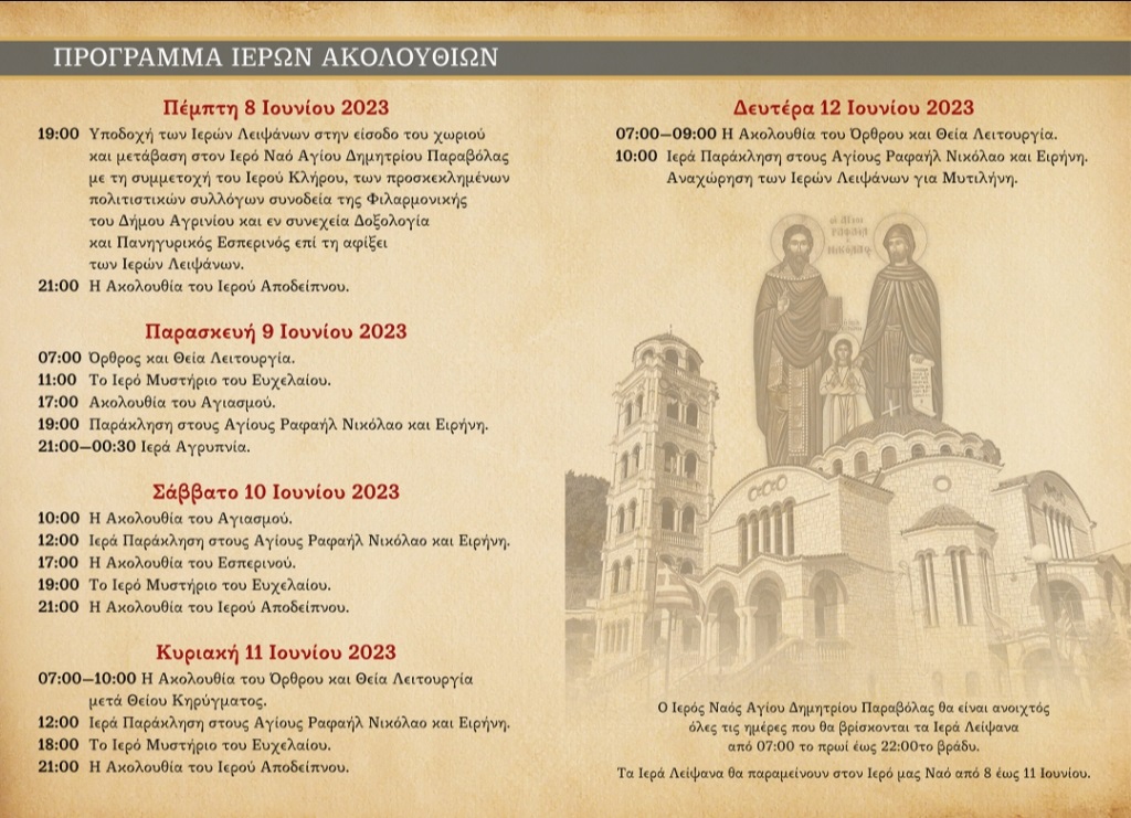 Την ερχόμενη Πέμπτη 8 Ιουνίου 2023 και ώρα 19:00’ στον Ιερό Ναό Αγίου Δημητρίου Παραβόλας θα πραγματοποιηθεί η υποδοχή Ιερών Λειψάνων των Αγίων Νεοφανών Μαρτύρων Ραφαήλ, Νικολάου και Ειρήνης, των εν Λέσβω μαρτυρησάντων.