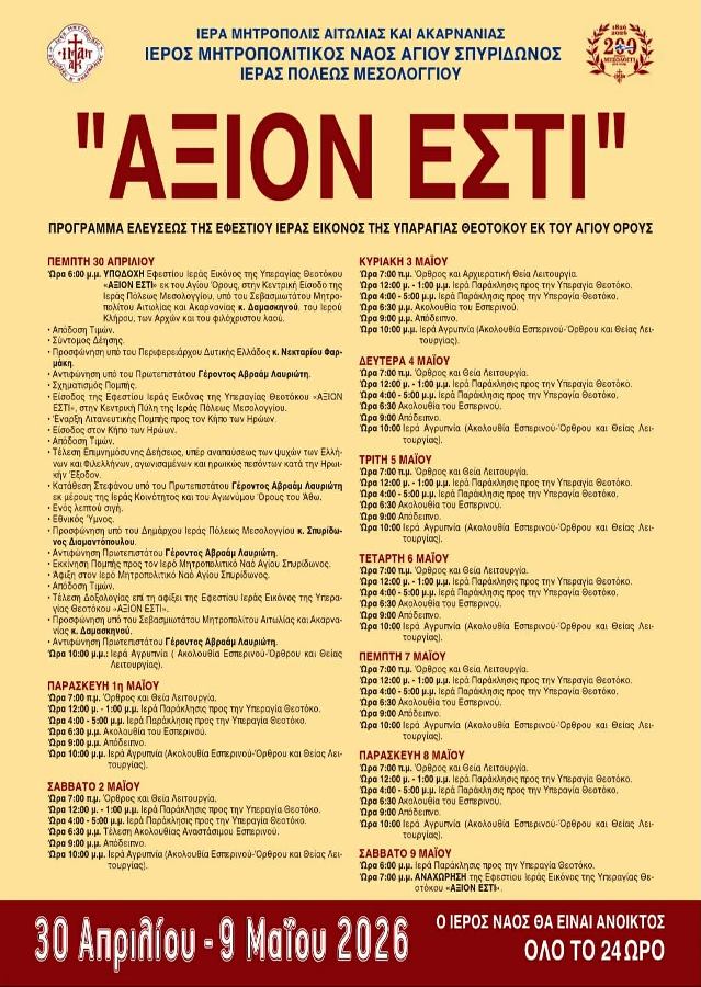 Η επίσημη υποδοχή της Ιεράς Εικόνος και της Ιεράς Κοινότητος του Αγίου Όρους που θα την συνοδεύει, αποτελούμενη από τον Πρωτεπιστάτη, Γέροντα Αβραάμ Λαυριώτη και τους είκοσι Αντιπροσώπους των Ιερών Μονών της Αθωνικής Πολιτείας θα πραγματοποιηθεί στην Ιερά Πόλη του Μεσολογγίου, την Πέμπτη 30 Απριλίου 2026 και ώρα 18:00’ το απόγευμα.
