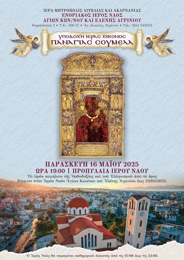19:00  Ὑποδοχὴ τῆς Ἱερᾶς Εἰκόνος τῆς Παναγίας Σουμελᾶ στὰ προπύλαια τοῦ Ἱεροῦ Ναοῦ Ἁγίων Κωνσταντίνου καὶ Ἑλένης Ἀγρινίου, ὑπὸ τοῦ Σεβασμιωτάτου Μητροπολίτου Αἰτωλίας καὶ Ἀκαρνανίας κ.κ. Δαμασκηνοῦ, τοῦ εὐλαβοῦς Κλήρου καὶ τοῦ φιλοχρίστου Λαοῦ.