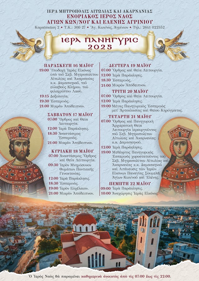 19:00  Μεθέορτος Πανηγυρικὸς Ἑσπερινός, χοροστατοῦντος τοῦ Σεβασμιωτάτου Μητροπολίτου Αἰτωλίας καὶ Ἀκαρνανίας κ.κ. Δαμασκηνοῦ, καὶ Λιτάνευσις τῶν Ἱερῶν Εἰκόνων Παναγίας Σουμελᾶ καὶ Ἁγίων Κωνσταντίνου καὶ Ἑλένης.