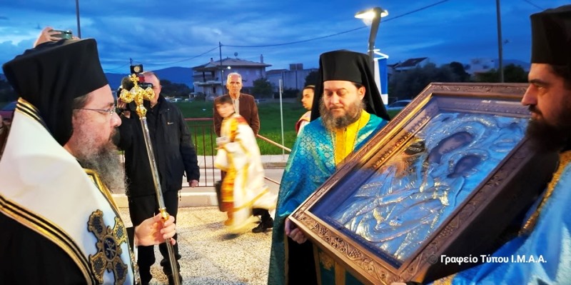 Της επίσημης υποδοχής που πραγματοποιήθηκε στα προπύλαια του Ιερού Ναού προέστη ο Σεβασμιώτατος Μητροπολίτης Αιτωλίας και Ακαρνανίας κ. Δαμασκηνός, επικεφαλής του Ιερού Κλήρου της πόλεως του Αγρινίου, των εκπροσώπων των τοπικών Αρχών και του Λαού.Το ιερό εικόνισμα μετέφερε ο Σεβασμιώτατος Μητροπολίτης Καλαβρύτων και Αιγιαλείας κ. Ιερώνυμος, συνοδευόμενος από τον Προϊστάμενο του Ιερού Προσκυνήματος, Πρωτοπρ. Γρηγόριο Μαμαλή.