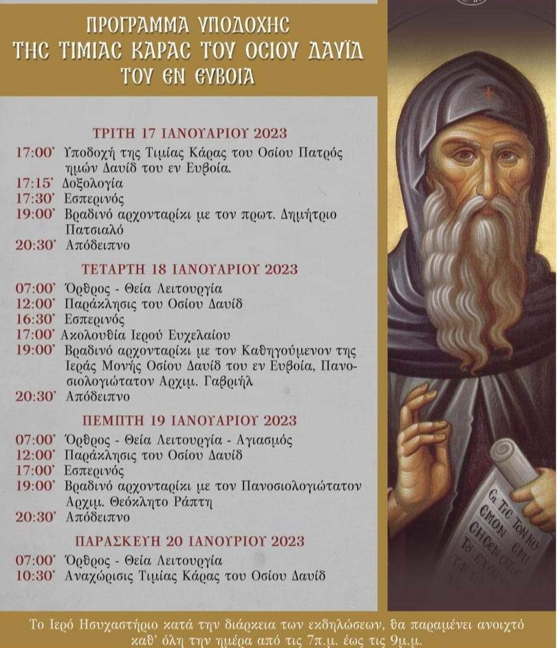 Την Τρίτη 17/01/2023 και ώρα 17:00 χάριτι Θεού θα πραγματοποιηθεί επίσημη υποδοχή της Τιμίας Κάρας του Οσίου Δαυίδ του γέροντος στον ιερό ναό Αγίου Κυπριανού και Ιουστίνης στο Παναιτώλιο Αγρινίου.