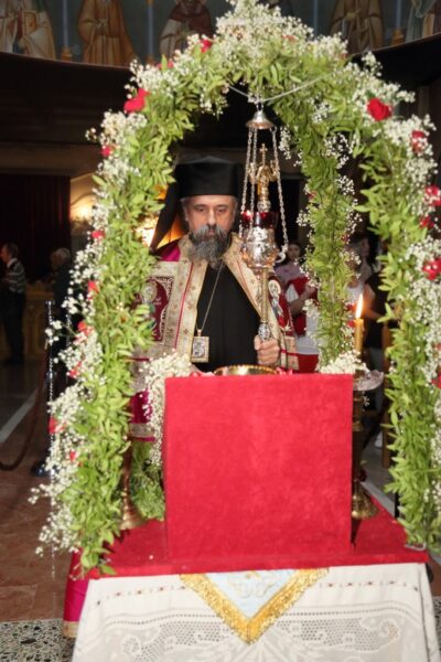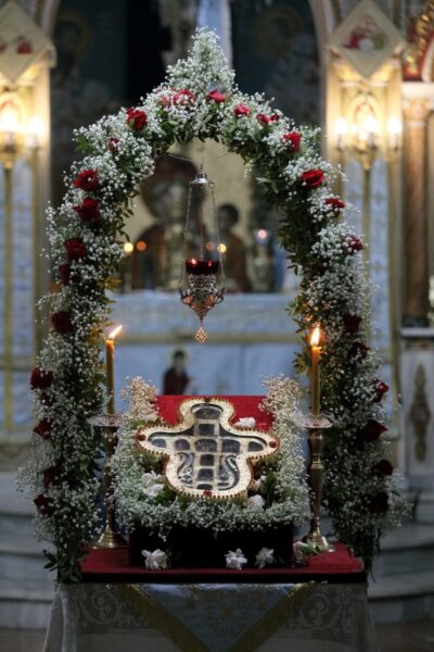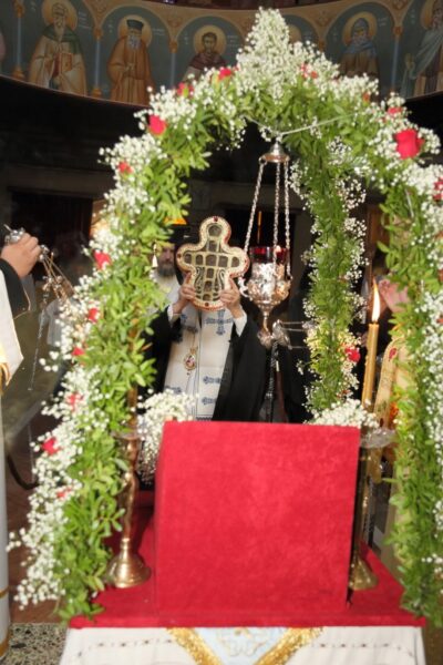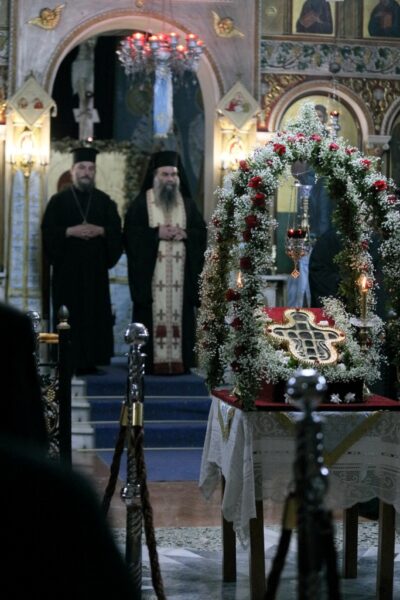 Το Τίμιο Ξύλο, απότμημα του Σταυρού του Κυρίου μας, τοποθετήθηκε στο κέντρο του ναού προς προσκύνηση και ευλογία των πιστών. Ακολούθησε μικρή δέηση (δοξολογία) και στη συνέχεια ο Αναστάσιμος Εσπερινός, χοροστατούντος του Σεβασμιωτάτου Μητροπολίτου Αιτωλίας και Ακαρνανίας κ. Κοσμά.