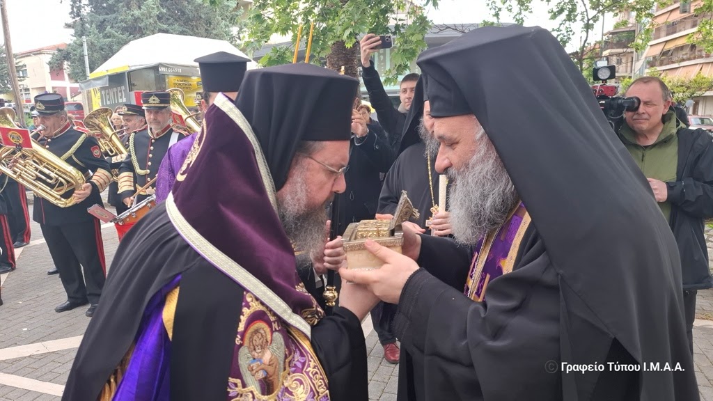 Η υποδοχή των ιερών κειμηλίων πραγματοποιήθηκε στον προαύλιο χώρο του Ιερού Ναού από τον Σεβασμιώτατο Μητορπολίτη Αιτωλίας και Ακαρνανίας κ. Δαμασκηνό, με τη συμμετοχή του Ιερού Κλήρου της πόλεως του Αγρινίου, με επικεφαλής τον Αρχιερατικό Επίτροπο Αγρινίου, Αρχιμ. Νεκτάριο Τριάντη και του πιστού Λαού, μεταξύ των οποίων ήταν η Αντιδήμαρχος κα Μαρία Παπαγεωργίου και ο Πρόεδρος του Δημοτικού Συμβουλίου κ. Κωνσταντίνος Ζώης.
