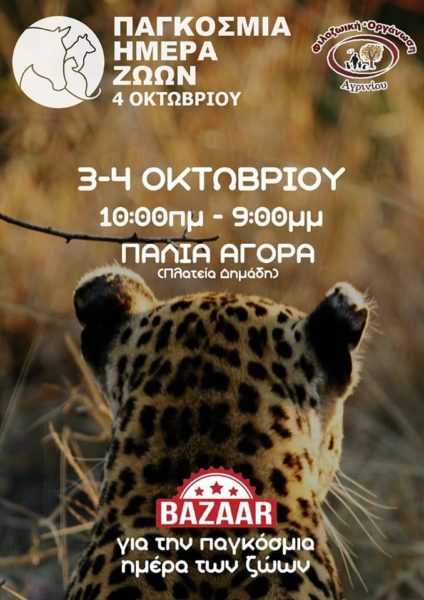Με αφορμή την Παγκόσμια Ημέρα των Ζώων ο σύλλογος της Φιλοζωικής Αγρινίου διοργάνωσε διήμερο bazaar στις 3 και 4 Οκτωβρίου 2019 στον χώρο της Παλιάς Λαχαναγοράς με σκοπό την ενημέρωση των συμπολιτών μας και την οικονομική στήριξη των δράσεων του συλλόγου.