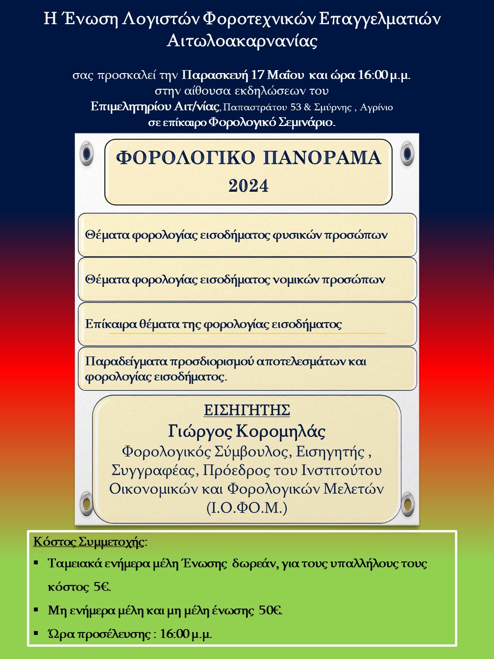 Φορολογική ημερίδα διοργανώνει η Ένωση Λογιστών Φοροτεχνικών Επαγγελματιών Αιτωλοακαρνανίας