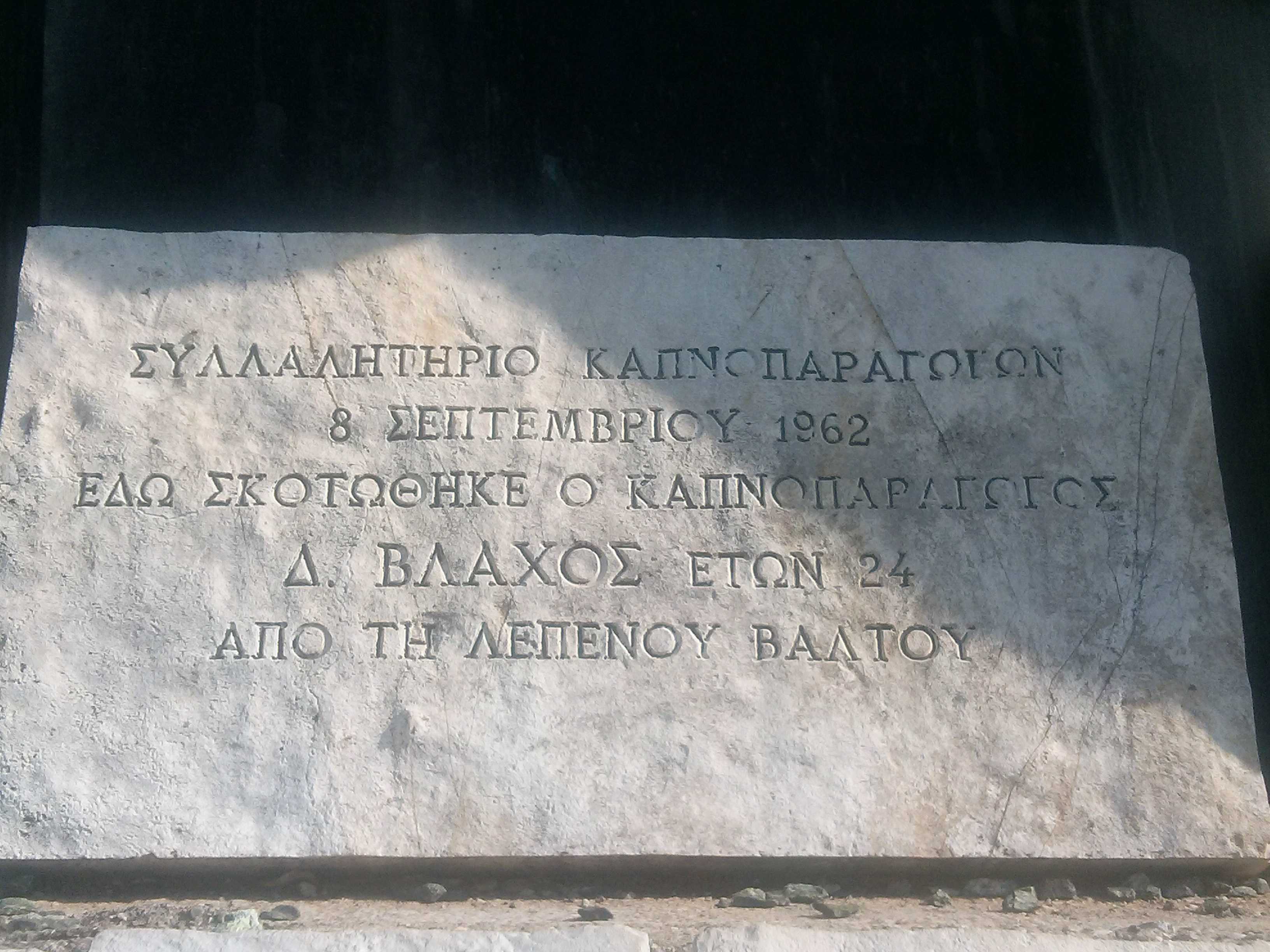 Υπενθυμίζεται ότι ο Μ. Βλάχος δολοφονήθηκε από αστυνομικές δυνάμεις στη διάρκεια των επεισοδίων που σημειώθηκαν την 8η Σεπτεμβρίου 1962, όταν αγρότες κι αγρότισσες, κατέλαβαν την Εθνική οδό Αμφιλοχίας-Αγρινίου στις τοποθεσίες «Σαμάρι», κοντά στο χωριό Στάνου, και την γέφυρα της Σφήνας, διακόπτοντας την κυκλοφορία από Αθήνα προς Γιάννενα και αντιστρόφως, σε ένδειξη διαμαρτυρίας για το γεγονός ότι οι καπνέμποροι και οι καπνοβιομήχανοι, σε μια επιπλέον προσπάθεια εκμετάλλευσης, καθυστερούσαν να αγοράσουν τη σοδειά τους, παρά την εσωτερική και διεθνή αύξηση της τιμής του καπνού και των τσιγάρων.