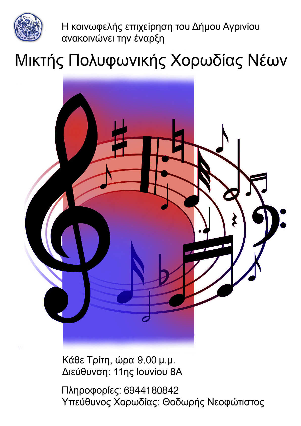 Η κοινωφελής επιχείρηση δήμου Αγρινίου ανακοινώνει την έναρξη της Μικτής Πολυφωνικής Χορωδίας Νέων (άνω των 18).