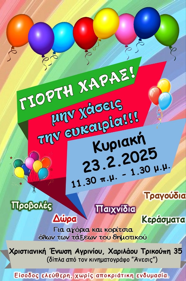Α) Για τα παιδιά του δημοτικού σχολείου η Χριστιανική Ένωσις Αγρινίου οργανώνει ένα δίωρο δημιουργικής και ευχάριστης απασχόλησης με προβολές, παιχνίδια, τραγούδια, διαγωνισμούς, δώρα, εκπλήξεις και πολλά άλλα. Την Κυριακή 23/2/2025 και ώρες 11:30 – 13:30 στα κτίρια επί της οδού Χαρ.