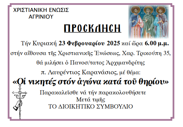 Β) Το απόγευμα της ίδιας ημέρας και ώρα 6:00 μ.μ. στην αίθουσα της Χριστιανικής Ενώσεως Αγρινίου θα μιλήσει ο αρχιμ. Λαυρέντιος Καρανάσιος, ιεροκήρυξ της Ιεράς Μητροπόλεως Αιτωλίας και Ακαρνανίας, με θέμα “Οι νικητές στον αγώνα κατά του θηρίου” (συνέχιση της ερμηνείας στην Αποκάλυψη του Ευαγγελιστή Ιωάννη).