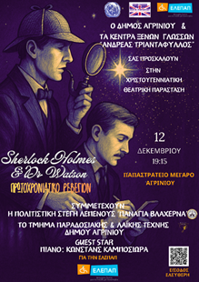 Στο πλαίσιο των χριστουγεννιάτικων εκδηλώσεων του Δήμου Αγρινίου με φορείς πολιτισμού της πόλης συνδιοργανώνει την Παρασκευή 12 Δεκεμβρίου 2025, στο Παπαστράτειο μέγαρο Αγρινίου, στις 19:15 μαζί με τα Φροντιστήρια Ξένων Γλωσσών «Ανδρέας Τριαντάφυλλος» και την ΕΛΕΠΑΠ Αγρινίου την χριστουγεννιάτικη παράσταση «Sherlock Holmes and Doctor Watson: Πρωτοχρονιάτικο Ρεβεγιόν», με σκοπό τη στήριξη των παιδιών της ΕΛΕΠΑΠ.