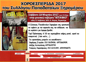 Ο Σύλλογος Παπαδαταίων Ξηρομέρου σας προσκαλεί στην ετήσια χοροεσπερίδα του, που θα πραγματοποιηθεί την 18 Μαρτίου 2017 ημέρα Σάββατο στην μουσική ταβέρνα « ΑΠΤΑΛΙΚΟ » οδός Π. Καβάλας 165, A. Λόφος, Περιστέρι. Τηλ. 210 5761476 Ώρα προσέλευσης 21:30.