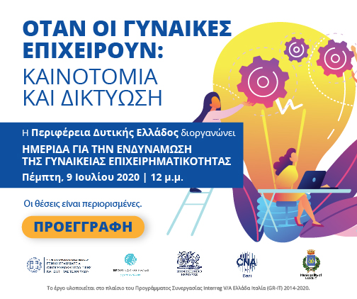 Στο πλαίσιο υλοποίησης του ευρωπαϊκού έργου ICON WOM-EN – “Integrating Innovation and Promoting Cluster Organization in WOMen Enterprises”, η Περιφέρεια Δυτικής Ελλάδος διοργανώνει την Πέμπτη 9 Ιουλίου 2020, στις 12 το μεσημέρι διαδικτυακή ημερίδα με θέμα την προώθηση και ενδυνάμωση της γυναικείας επιχειρηματικότητας.