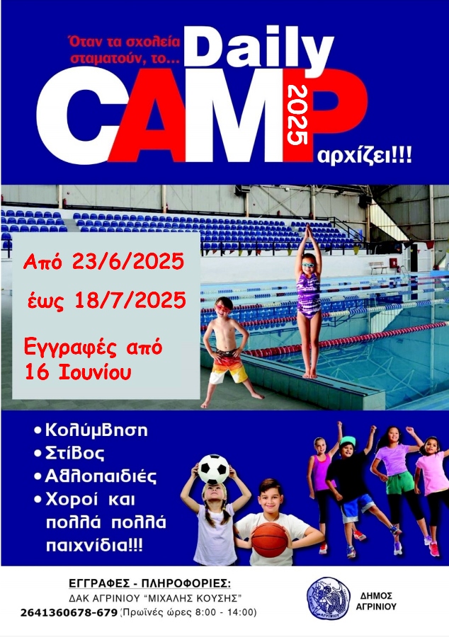Από τις 23 Ιουνίου έως 18 Ιουλίου διοργανώνεται στο Δημοτικό Αθλητικό Κέντρο Αγρινίου «Μιχάλης Κούσης» το Daily Camp 2025 με προγράμματα κολύμβησης, στίβου, χορού και πολλά παιχνίδια για τα παιδιά ηλικίας 5-12 ετών.