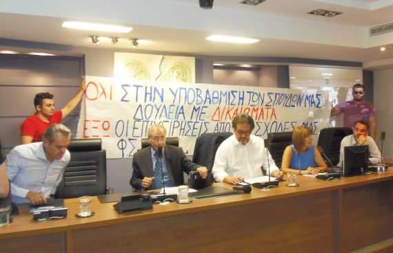 Οι φοιτητές εμπόδισαν την έναρξη της εκδήλωσης παρεμβαίνοντας δυναμικά στην αίθουσα του Επιμελητηρίου για να διατρανώσουν την αντίθεσή τους στο αίτημα που εκφράζεται από πολλούς τοπικούς φορείς.