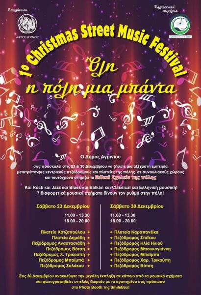 Μουσική θα γεμίσουν οι πλατείες και οι πεζόδρομοι της πόλης του Αγρινίου στις 23 και στις 30 Δεκεμβρίου 2023.