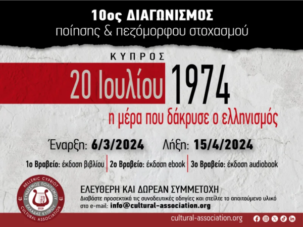 Ο Σύνδεσμος Πολιτισμού Ελλάδας Κύπρου | Σ.Π.Ε.Κ. σε συνεργασία με τις εκδόσεις Αρχύτας, προκηρύσσει 10ο Διαγωνισμό ποίησης & πεζόμορφου στοχασμού με θέμα “ΚΥΠΡΟΣ 20 Ιουλίου 1974, η μέρα που δάκρυσε ο ελληνισμός “. Ο 10ος Διαγωνισμός αρχίζει στις 06/03/2024 και λήγει στις 15/04/2024.