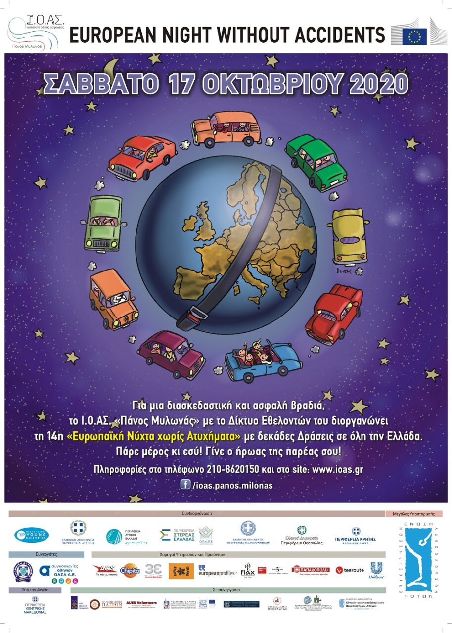 Το Ινστιτούτο Οδικής Ασφάλειας (Ι.Ο.ΑΣ.) «Πάνος Μυλωνάς» διοργανώνει, το Σάββατο 17 Οκτωβρίου 2020 την 14η «Ευρωπαϊκή Νύχτα χωρίς Ατυχήματα» σε 34 μεγάλες πόλεις στην Ελλάδα. Ο κεντρικός της άξονας είναι ότι «αλκοόλ και οδήγηση δεν πάνε μαζί» ενώ το μήνυμά στην Ελλάδα είναι η προτροπή, στις παρέες, να ορίσουν ένα άτομο που δεν θα καταναλώσει ποτό εκείνη τη βραδιά και θα αναλάβει τον ρόλο του «οδηγού της παρέας»!