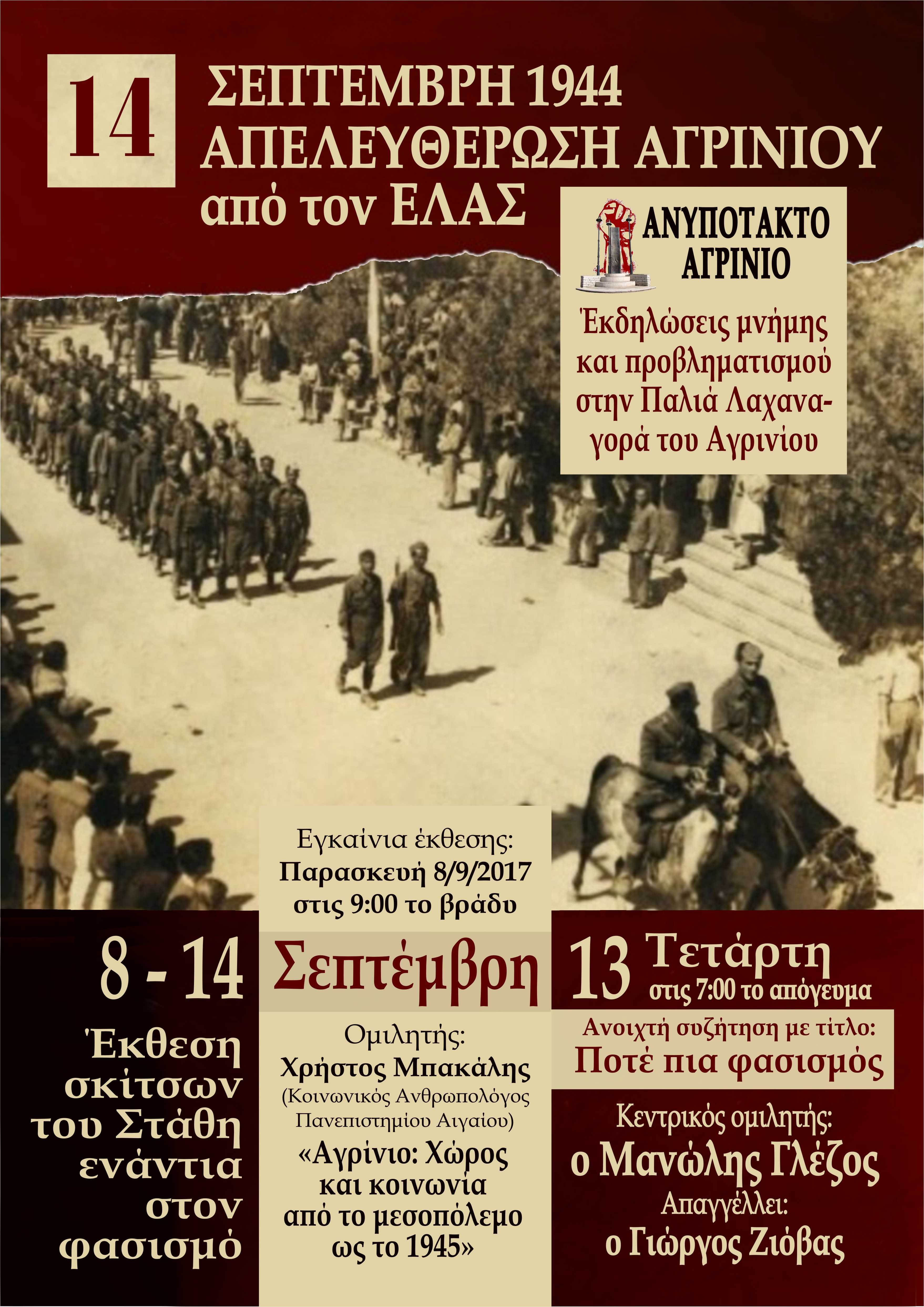 Το ΑΝΥΠΟΤΑΚΤΟ ΑΓΡΙΝΙΟ, επιθυμώντας να αναδείξει την επέτειο της απελευθέρωσης της πόλης του Αγρινίου από την Γερμανική και Ταγματασφαλίτικη Κατοχή στις 14 Σεπτέμβρη του 1944, διοργανώνει μία σειρά εκδηλώσεων μνήμης και πολιτικού προβληματισμού με κεντρικό σύνθημα: «Ποτέ πια φασισμός».