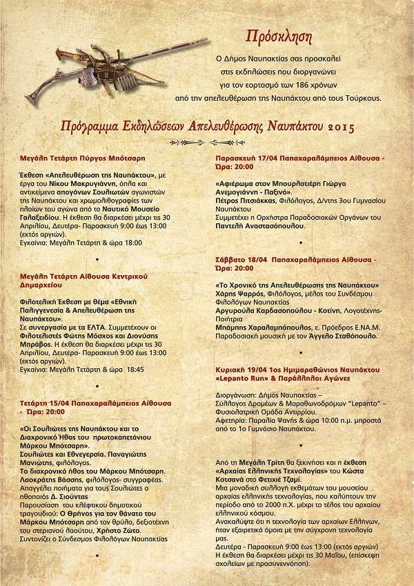 Η 186η επέτειος της απελευθέρωσης της Ναυπάκτου είναι προ των πυλών και ο δήμος Ναυπακτίας ετοιμάζει ορισμένες εκδηλώσεις.