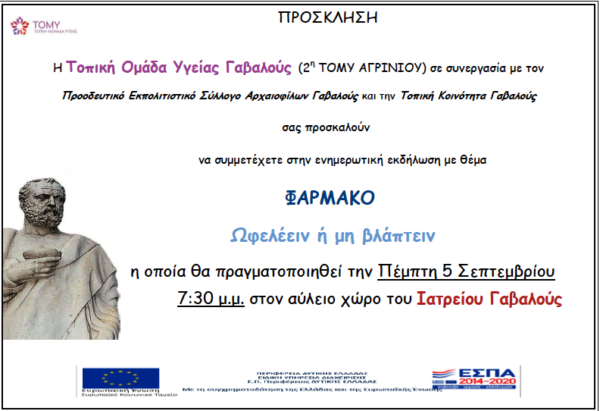 Πρόσκληση της εκδήλωσής με θέμα το Φάρμακο και την αλόγιστη χρήση αυτού καθώς και τις παρενέργειες του.
