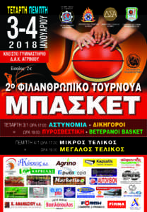 Στις 3-4/01/2018 σας περιμένουμε όλους να απολαύσετε ένα μπασκετικό διήμερο στηρίζοντας συνανθρώπους μας που χρειάζονται την βοήθειά μας.