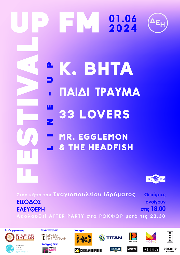 Το Σάββατο 1η Ιουνίου, ο UP FM υπό την αιγίδα και οικονομική στήριξη του Πανεπιστημίου Πατρών και σε συνδιοργά-νωση με την Περιφέρεια Δυτ. Ελλάδας και συνεργασία με το Ίδρυμα Τοπά-λη, διοργανώνει το 2ο μουσικό του φεστιβάλ με δωρεάν είσοδο στον Κήπο του Σκαγιοπουλείου Ιδρύματος.
