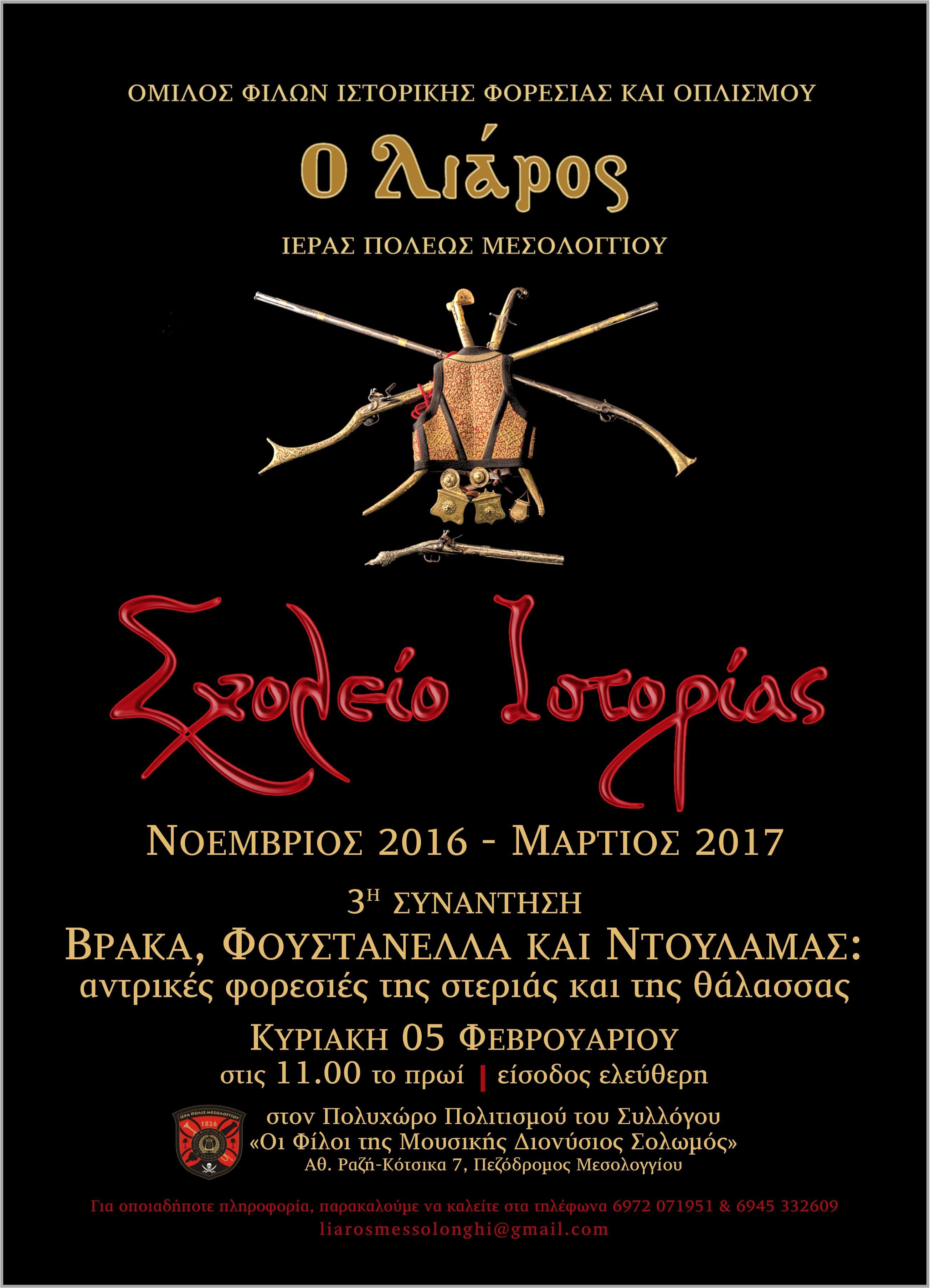 H τρίτη συνάντηση του “Σχολείου Ιστορίας”, του εκπαιδευτικού προγράμματος που οργανώνει ο Όμιλος Φίλων Ιστορικής Φορεσιάς και Οπλισμού “ο Λιάρος”, θα πραγματοποιηθεί την προσεχή Κυριακή 5η Φεβρουαρίου, στις 11.00 το πρωί, με θέμα “Βράκα, Φουστανέλλα και Ντουλαμάς: Αντρικές φορεσιές της στεριάς και της θάλασσας”.