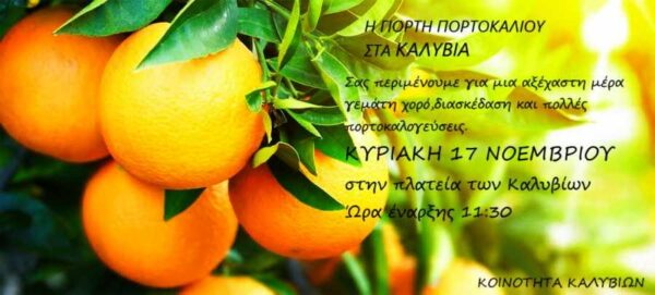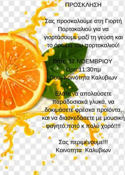 Ο Δήμος Αγρινίου και η Κοινότητα Καλυβίων σας προσκαλούν να συμμετάσχετε στην 4η Γιορτή Πορτοκαλιού που θα πραγματοποιηθεί την Κυριακή 17 Νοεμβρίου 2024.