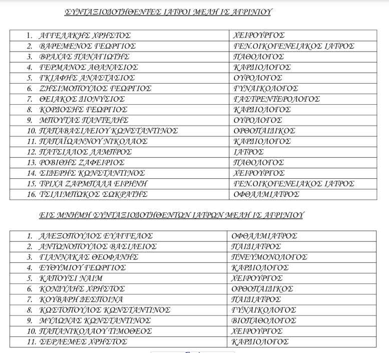 Επισυνάπτονται τα ονόματα των συνταξιοδοτηθέντων ιατρών μελών του l. Σ. Αγρινίου (2014-2ο21)