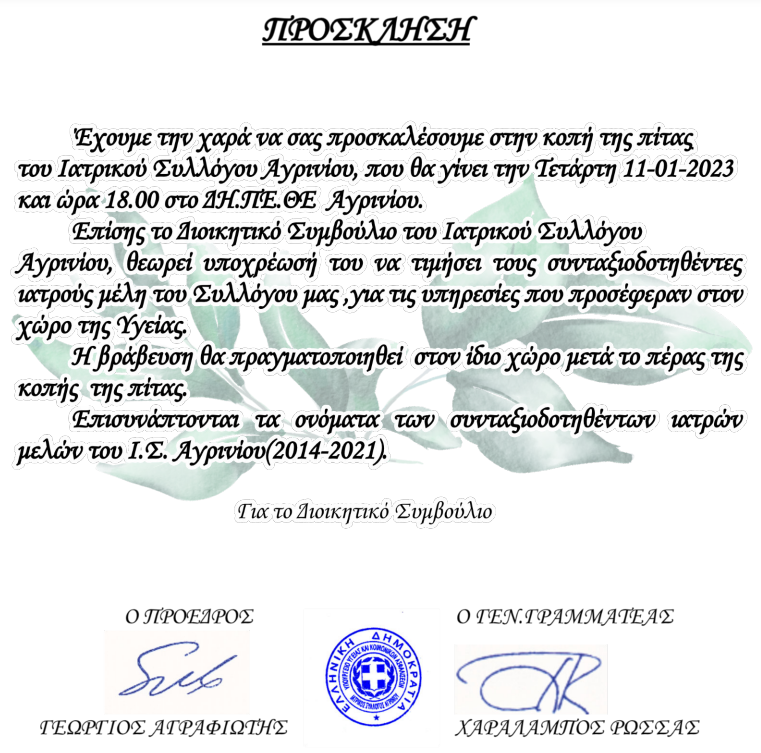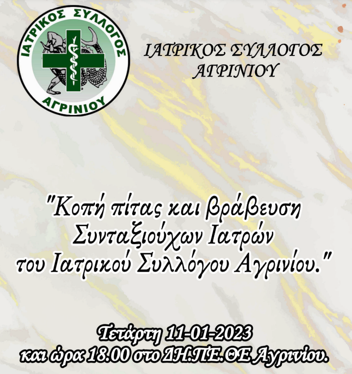 Έχουμε την χαρά να σας προσκαλέσουμε στην κοπή της πίτας του Ιατρικού Συλλόγου Αγρινίου, που θα γίνει την Τετάρτη 11-01-2023 και ώρα 18.00 στο ΔΗ.ΠΕ.Ε Αγρινίου.