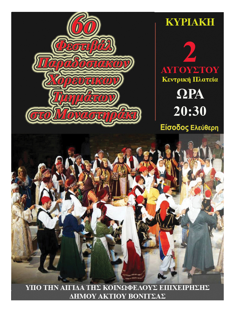 Την Κυριακή 2, Αυγούστου οι καλοκαιρινές πολιτιστικές διαδρομές του Δήμου Ακτίου Βόνιτσας μεταφέρονται στο Μοναστηράκι για την διοργάνωση του 6ου Φεστιβάλ Παραδοσιακών Χορευτικών Τμημάτων του Δήμου Ακτίου Βόνιτσας.
