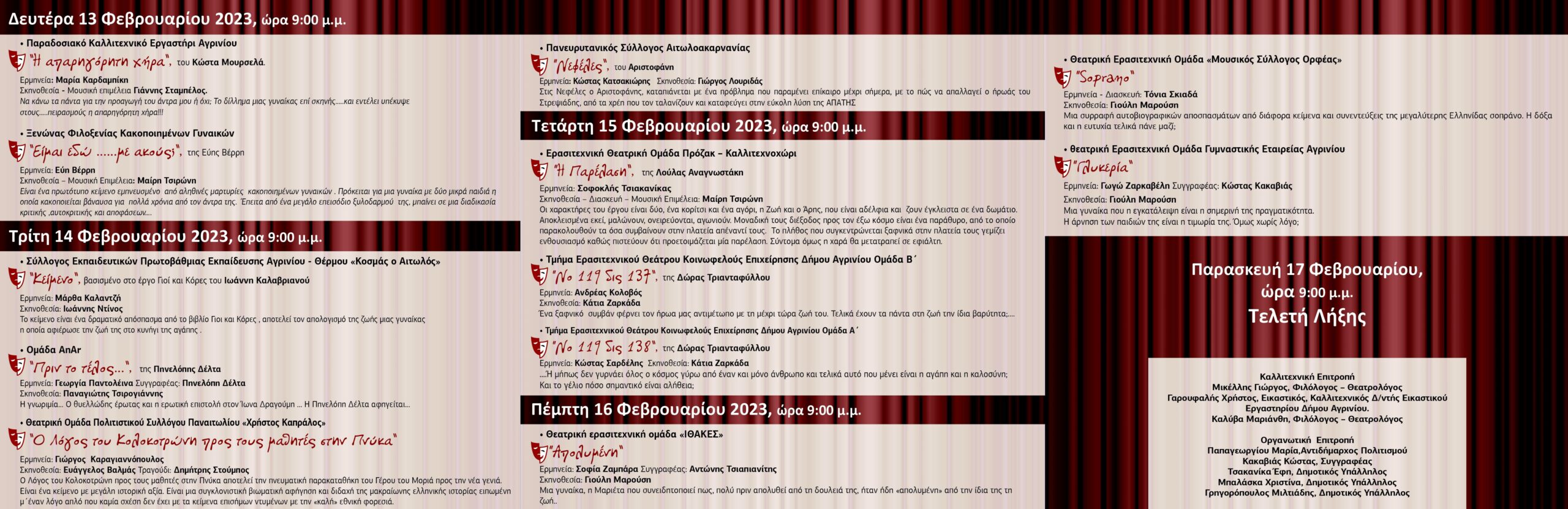 Ξεκινά τη Δευτέρα 13 Φεβρουαρίου 2023 το ΄΄6ο Φεστιβάλ Μονολόγων Ερασιτεχνών΄΄ που διοργανώνει η Κοινωφελής Επιχείρηση του Δήμου Αγρινίου.