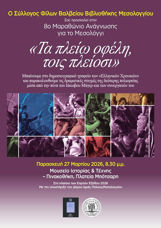 Ο Δήμος Ιεράς Πόλεως Μεσολογγίου και ο Σύλλογος Φίλων της Βαλβείου Βιβλιοθήκης διοργανώνουν τον 8ο Μαραθώνιο Ανάγνωσης για το Μεσολόγγι : «Τα πλείω οφέλη, τοις πλείοσι».