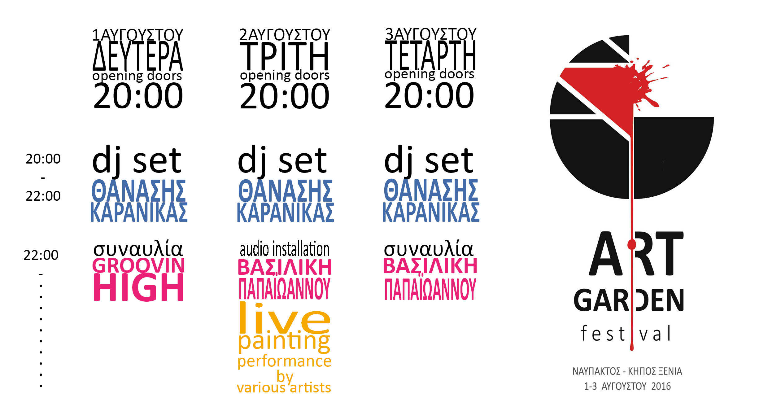 Η Κοιν.Σ.Επ. “Προβάλλω την Ναυπακτία” σας προσκαλεί στο πρώτο φεστιβάλ εικαστικών τεχνών, Art Garden Festival Ναύπακτος 2016, σε μία τριήμερη συνάντηση στις 1, 2 και 3 Αυγούστου 2016 στον κήπο του Ξενία, παραλία Γριμπόβου, Ναύπακτος.