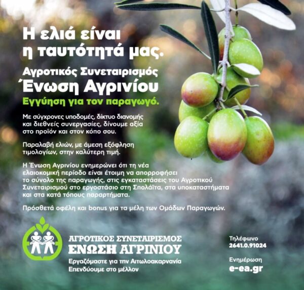 H Ένωση Αγρινίου διαμόρφωσε και ανακοινώνει τον νέο τιμοκατάλογο αγοράς πράσινων ελιών εσοδείας 2025 – 2026.