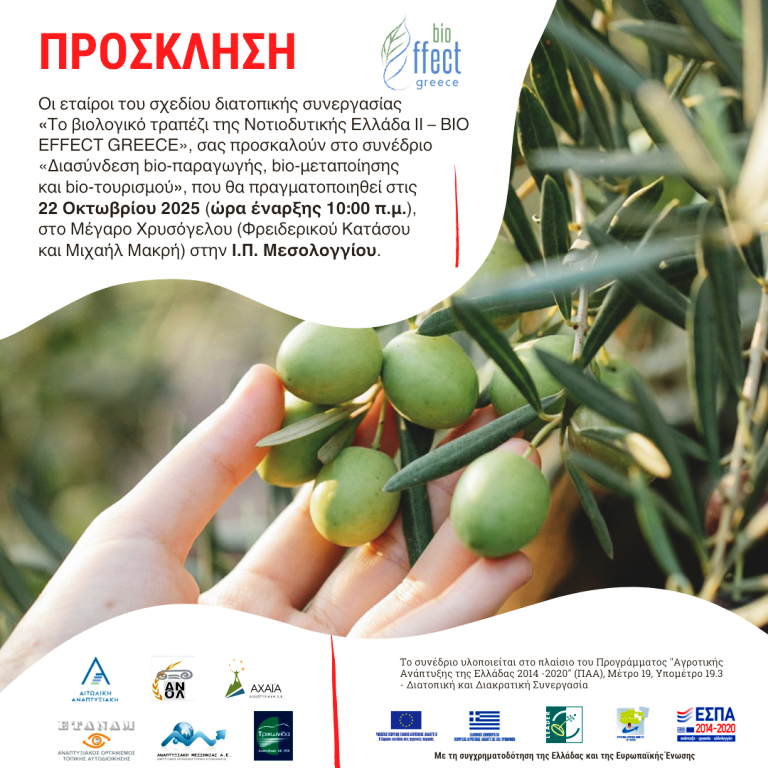 Συνέδριο για την «Διασύνδεση bio-παραγωγής, bio-μεταποίησης και bio-τουρισμού» πραγματοποιείται την Τετάρτη 22 Οκτωβρίου 2025 (ώρα έναρξης 10πμ), στο Μέγαρο Χρυσόγελου, στην Ι.Π. Μεσολογγίου.